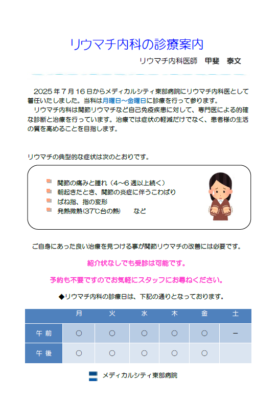 7月16日からリウマチ内科の診療が可能となりました。 詳しくは以下の案内をご確認ください。